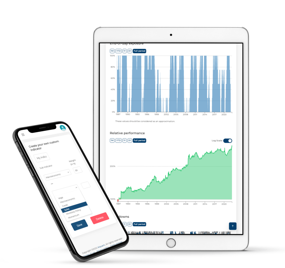 Apply Alquant's actionable risk indicators on various equity indices. Alquant's risk indicators are based on multiple data sources, which are systematically measured and translated into individual risk indicators covering various market factors. Identify market phases with low and high crash risks and allocate equity in a risk-controlled manner. Participate in favorable market phases while minimizing risk. Avoid larger losses during turbulence by systematically reducing equity exposure. Adjust risk indicators to specific investment constraints and compare the results to various benchmarks to directly analyze how they can help you reduce drawdowns and outperform in rising markets.